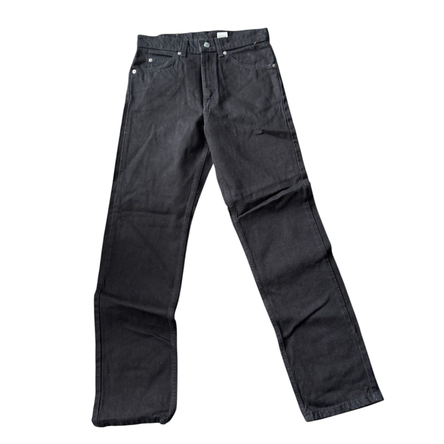 Crafted from heavy-duty, 100% cotton black denim, these jeans offer the classic straight-leg silhouette with the signature zip fly. Being New with Tags, they remain in the exact condition they were in when they left the factory over 25 years ago.